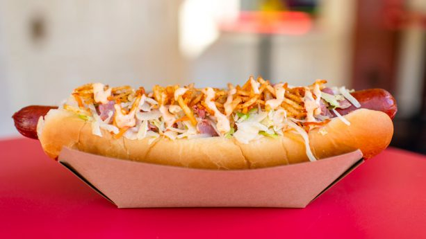 - Corned Beef Hash Dog – Topped with crispy potatoes, corned beef, cabbage, and a Blarney sauce drizzle.