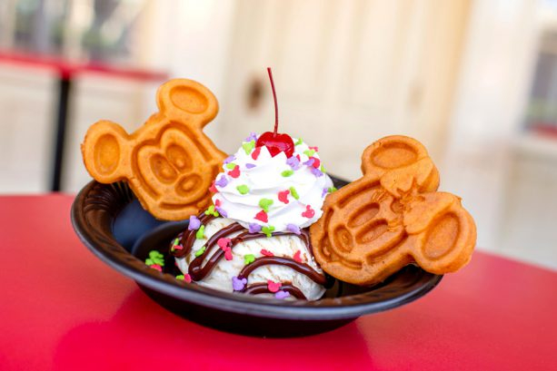 - Mickey and Minnie Waffle Sundae – Mickey and Minnie-shaped waffles and a scoop of vanilla ice cream topped with chocolate sauce, whipped cream, sprinkles, and a cherry.