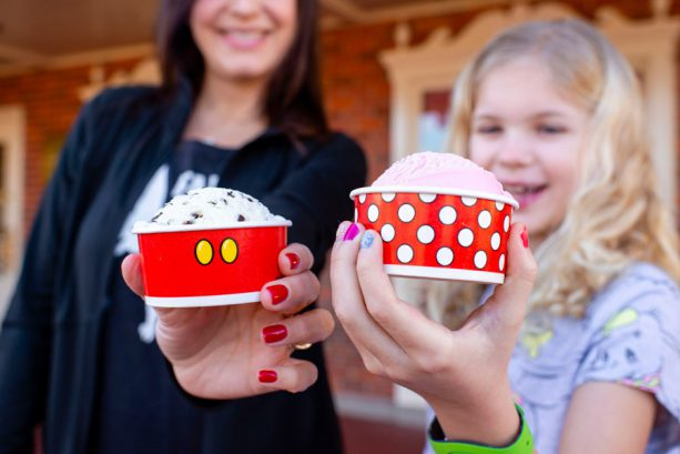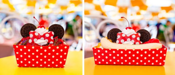 - Main Street Split – Ice-cream and a banana topped with strawberry and pineapple sauces, hot fudge, chocolate cream cookies, and a chocolate Minnie bow.