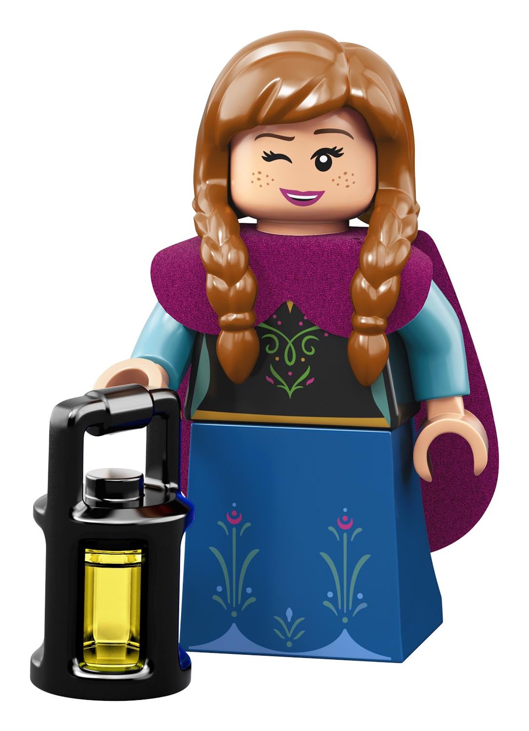 - Anna is all smiles and is dressed in her traveling look from Frozen. She carries a bright lantern.