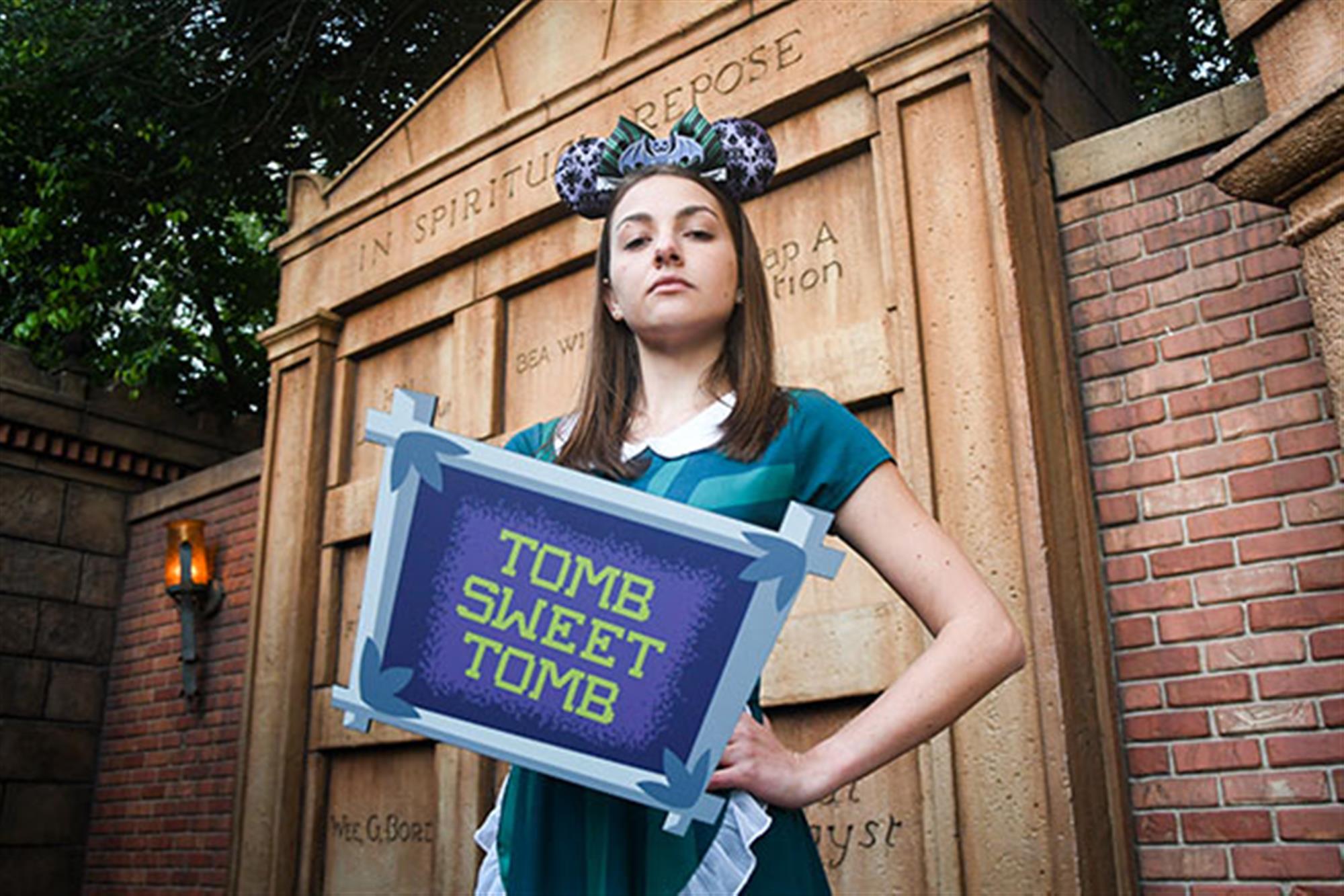 - Beginning at 9 am, guests can look for the photographer near the exit of the Haunted Mansion who will offer a “Tomb Sweet Tomb” prop, available during daylight hours.