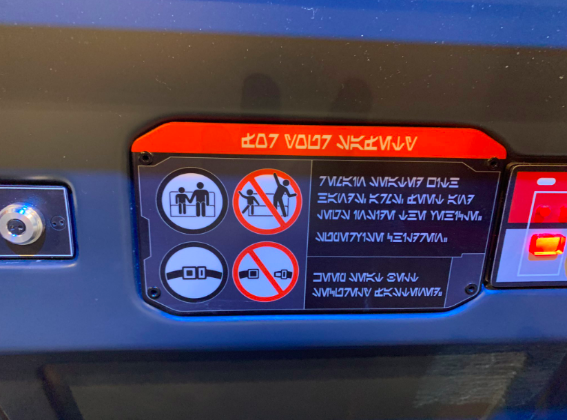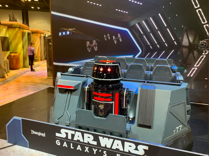 The booth features one of the ride vehicles for the highly-anticipated Rise of the Resistance attraction coming to the lands at both Disneyland and Walt Disney World. Guests can see an eight-passenger vehicle led by an Astromech droid as well as a safety warning in the Star Wars language of Aurebesh.