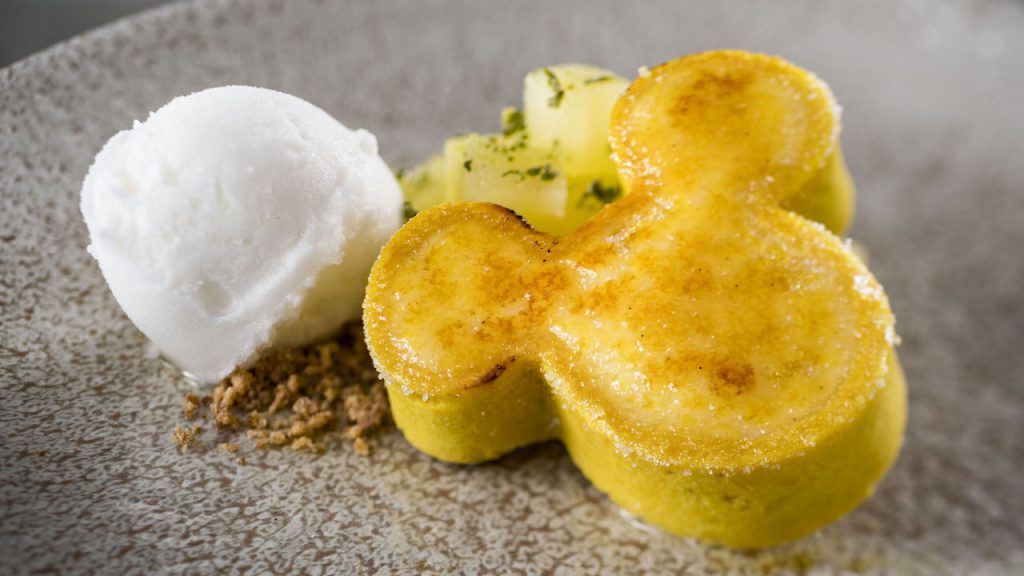 - For dessert, guests can enjoy warm churros with Espelette pepper sugar and chocolate sauce or a vanilla custard Mickey tart with compressed pineapple and tropical sorbet.