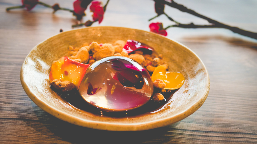 - Kumo — yuzu cheesecake, spiced kabocha, orange yuzu gel and blackberry sake
