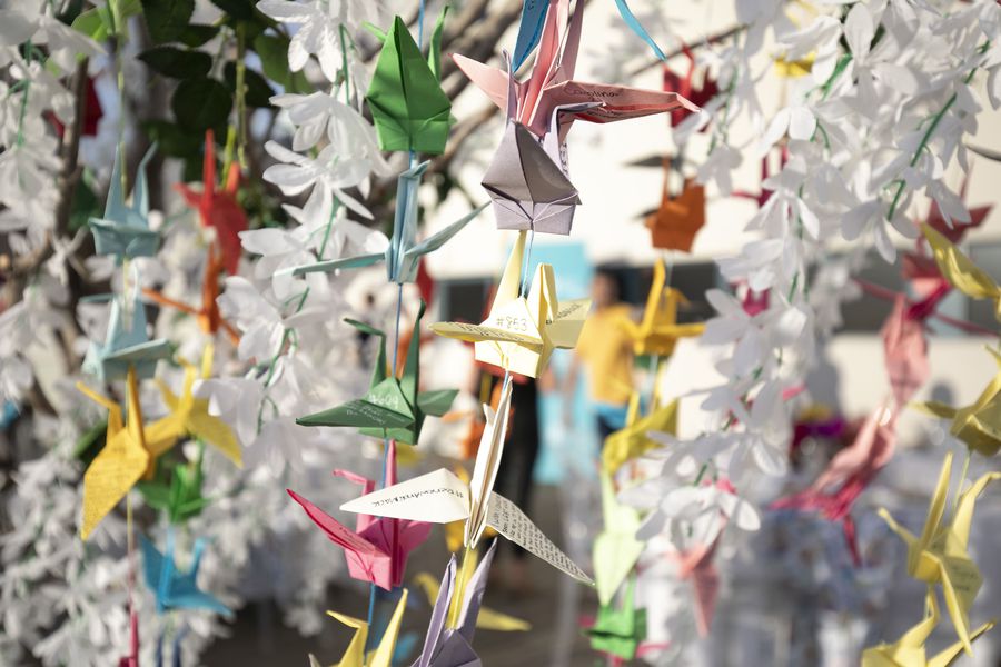 - The display is made of 1000 paper cranes, categorized and separated into strands of 10, each with a handwritten message from viewers around the world.