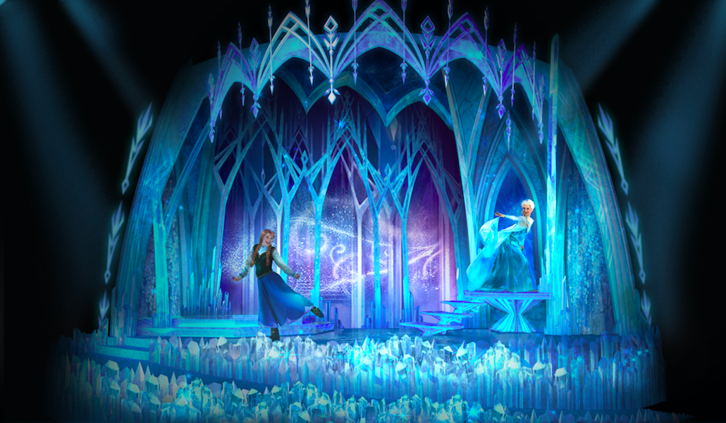 - Act two – A sing-song surprise: After mastering your magical moves, you leave the comfort of the barns, battling the whooshing wind until you enter the spectacularly sparkly Ice Palace on the peak of North Mountain. Now’s the time to surprise Elsa, celebrating her power and the magic that can be found in all of us, before joining in with joyful renditions of “Let It Go” and “Love Is an Open Door.” Then, warm up with a warm hug from Olaf.
