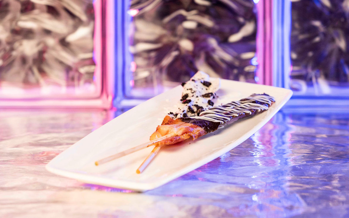 - Also at the Starcourt Mall food court, guests will find a dessert tent serving up chocolate dipped bacon on a stick and Pumpkin Patch Mini Donuts.