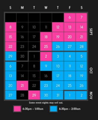 - The event will end at 1 AM on the night of the 21, as opposed to ending at 2 AM as it does on most nights in October.