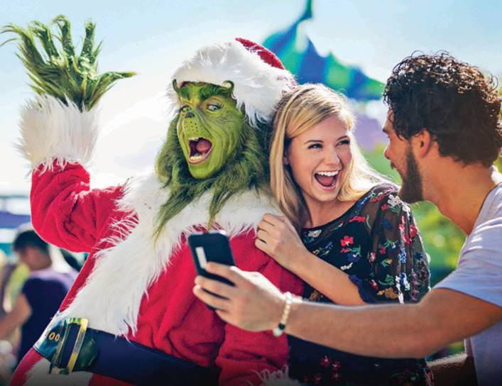 - An all-new state-of-the-art, topsy-turvy “Grinchmas” tree, twisting and turning over 55 feet in height and adorned with hundreds of ornaments and thousands of white and multi-colored LED lights choreographed to music, brightens the merry “Grinchmas” Who-lebration. Dazzling “Grinchmas” tree lighting ceremonies that take place every evening, accompanied by a snowfall flurry, bring this annual favorite to life, creating a festival of fun fit for The Grinch, his faithful dog Max and a roster of Who-ville Whos.