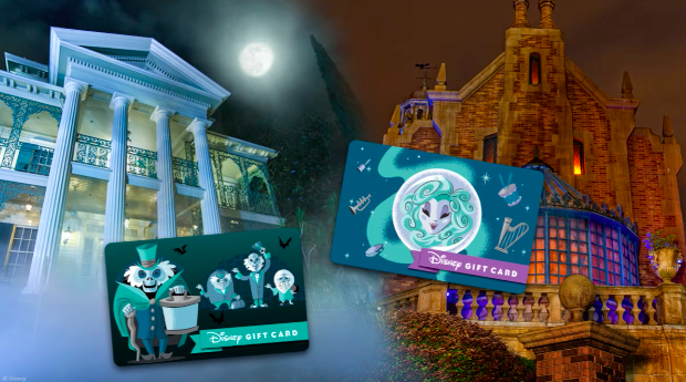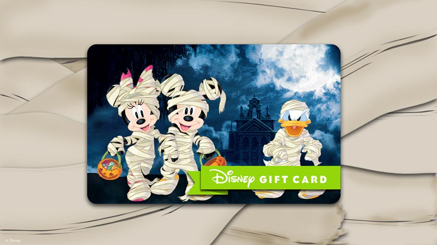 - For those who will not be visiting either resort any time soon, a third design featuring Mickey, Minnie and Donald outside their own Haunted Mansion is available on DisneyGiftCard.com and shopDisney through October 27.