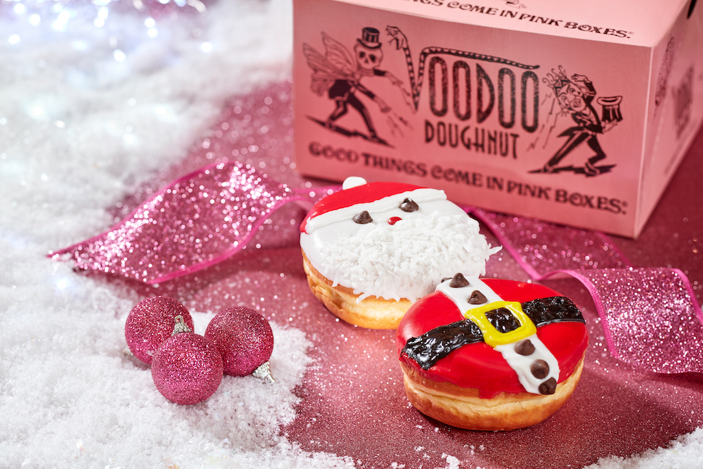 - Voodoo Doughnut’s Stuffed Santa Suit doughnut set, which are yeast doughnuts dipped in Vanilla icing – one filled with Bavarian & white chocolate topped with Coconut and one filled with peppermint chocolate cream