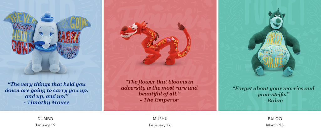 - shopDisney has shared a sneak peek at their upcoming 2019 collection, Disney Wisdom. Each month, a new limited edition character plush will be featured along with other collectables such as pins, mugs, and journals.