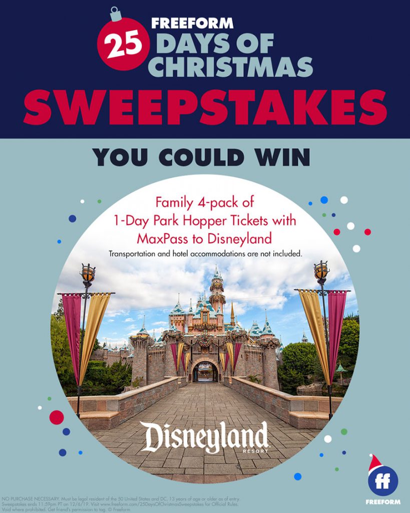 Freeform’s “25 Days of Christmas” is underway and the holiday season is upon us. Now, you can celebrate the season by entering Freeform’s 25 Days of Christmas Sweepstakes for a chance to win some great prizes including a trip to Disneyland.