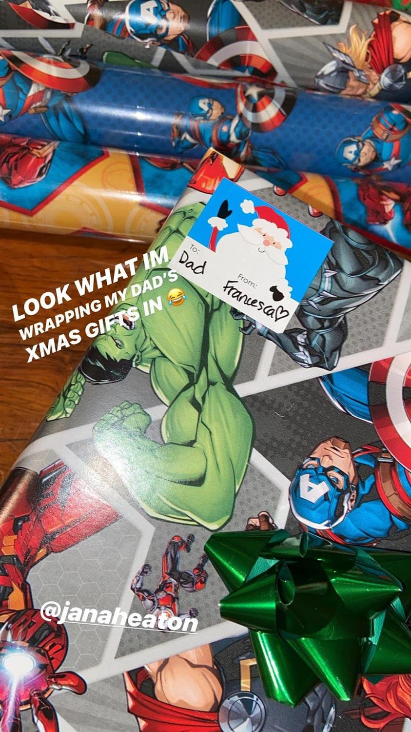 - Scorsese shared a picture in her Instagram story showing off a few rolls of super hero wrapping paper that featured the Avengers. She captioned the post, “Look at what I’m wrapping my Dad’s xmas gifts in.”