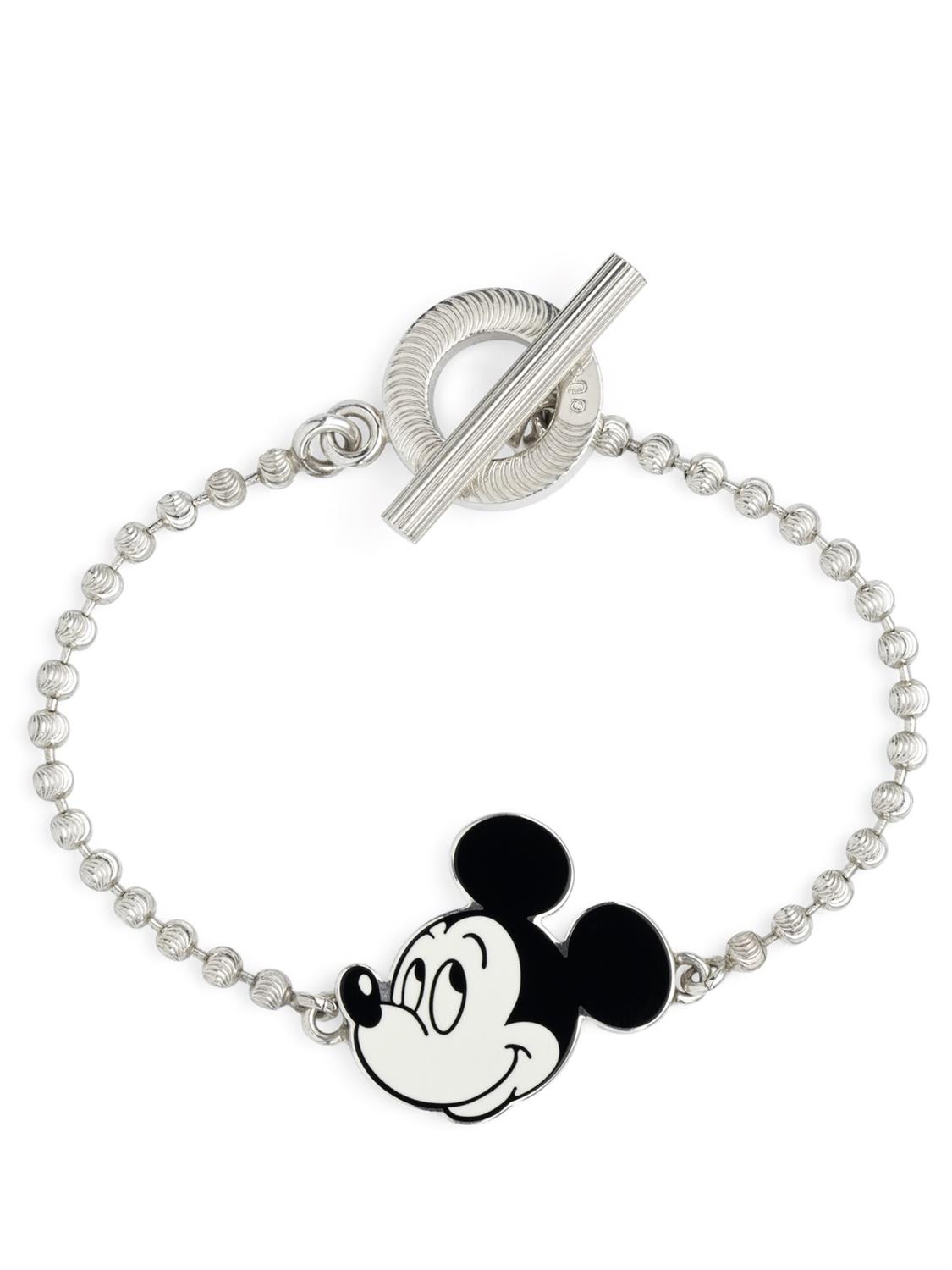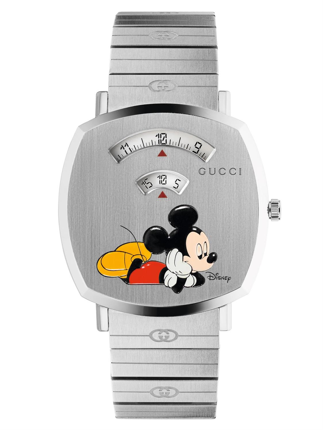 The distinctive Gucci Grip watch also displays the playful Mickey Mouse motif, and, for jewelry, an enamel Mickey appears on sterling silver designs.