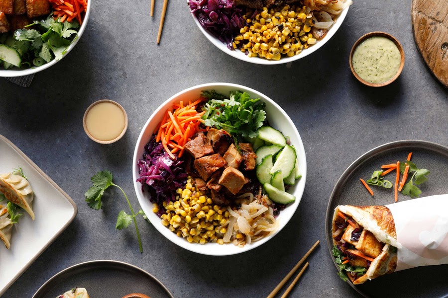 - Customizable Mixed Bowls - Grilled chicken, braised beef short rib, or sauteed tofu with royal purple rice or mixed greens topped with fire-roasted corn, cabbage, cucumbers, pickled carrots, caramelized onions, and your choice of sauce.
