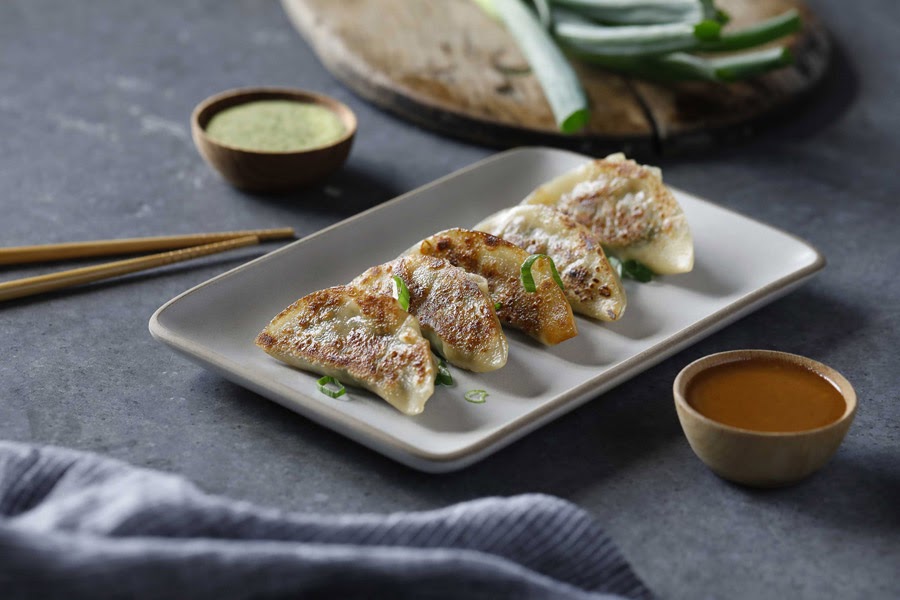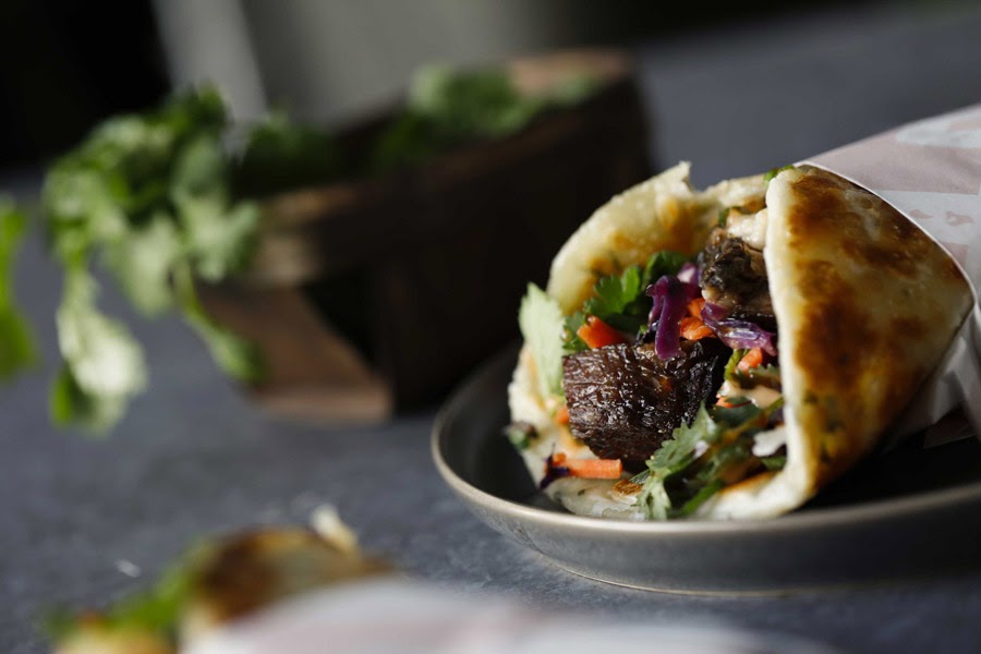 - Scallion Pancake Wrap - Grilled chicken, braised beef short rib, or sauteed tofu wrapped in a scallion pancake stuffed with cabbage, caramelized onions, pickled carrots, cucumbers, cilantro, hoisin sauce, and sriracha aioli and your choice of sauce.