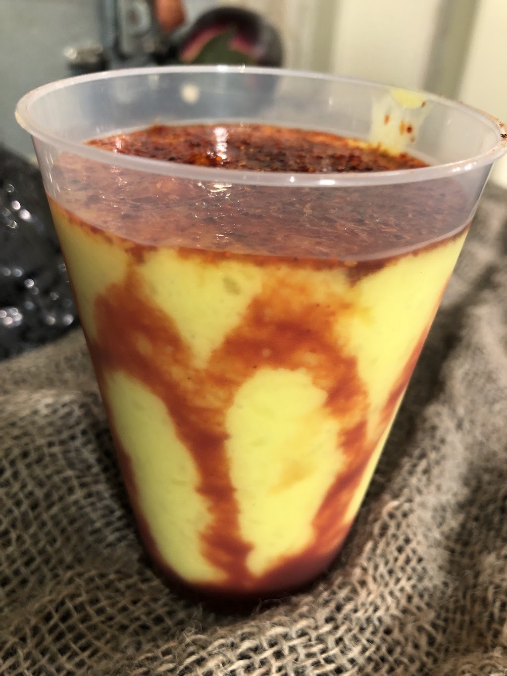 - So what’s actually inside? This beverage features Green milk with mango jellies and sweet savory chili lime seasoning.