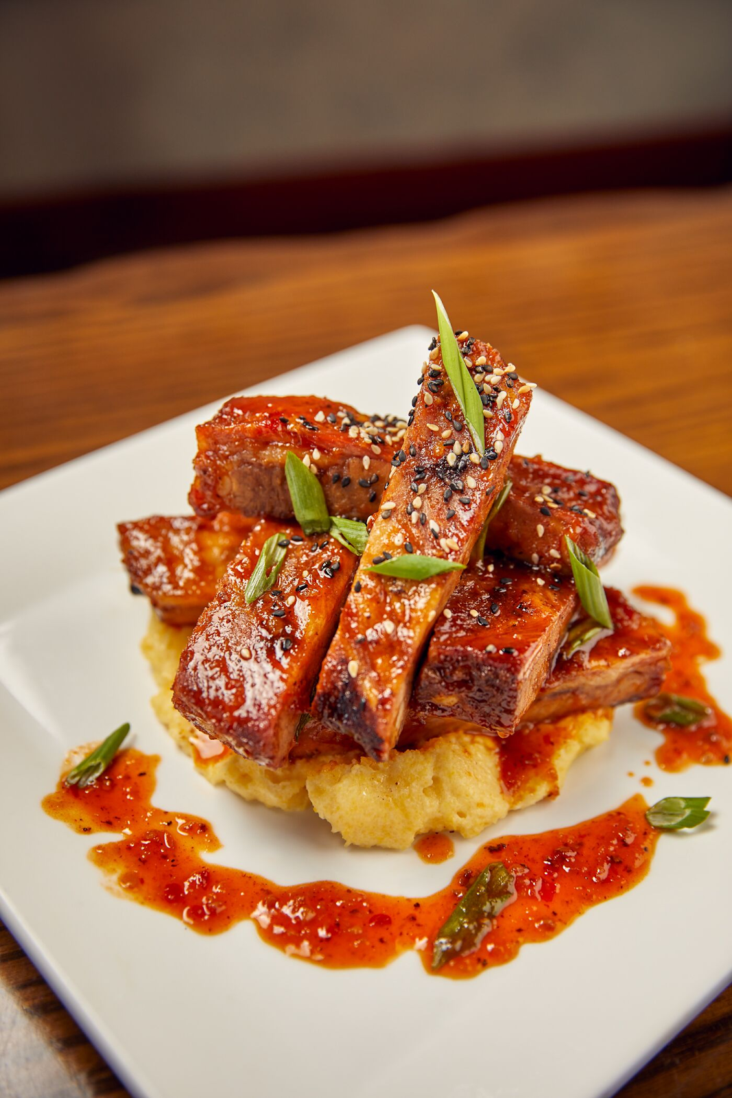 - Sweet and Sour Sticky Ribs: Philippine-inspired smoked pork ribs tossed in a sweet and sour sauce, served over goat cheese polenta and topped with toasted sesame seeds