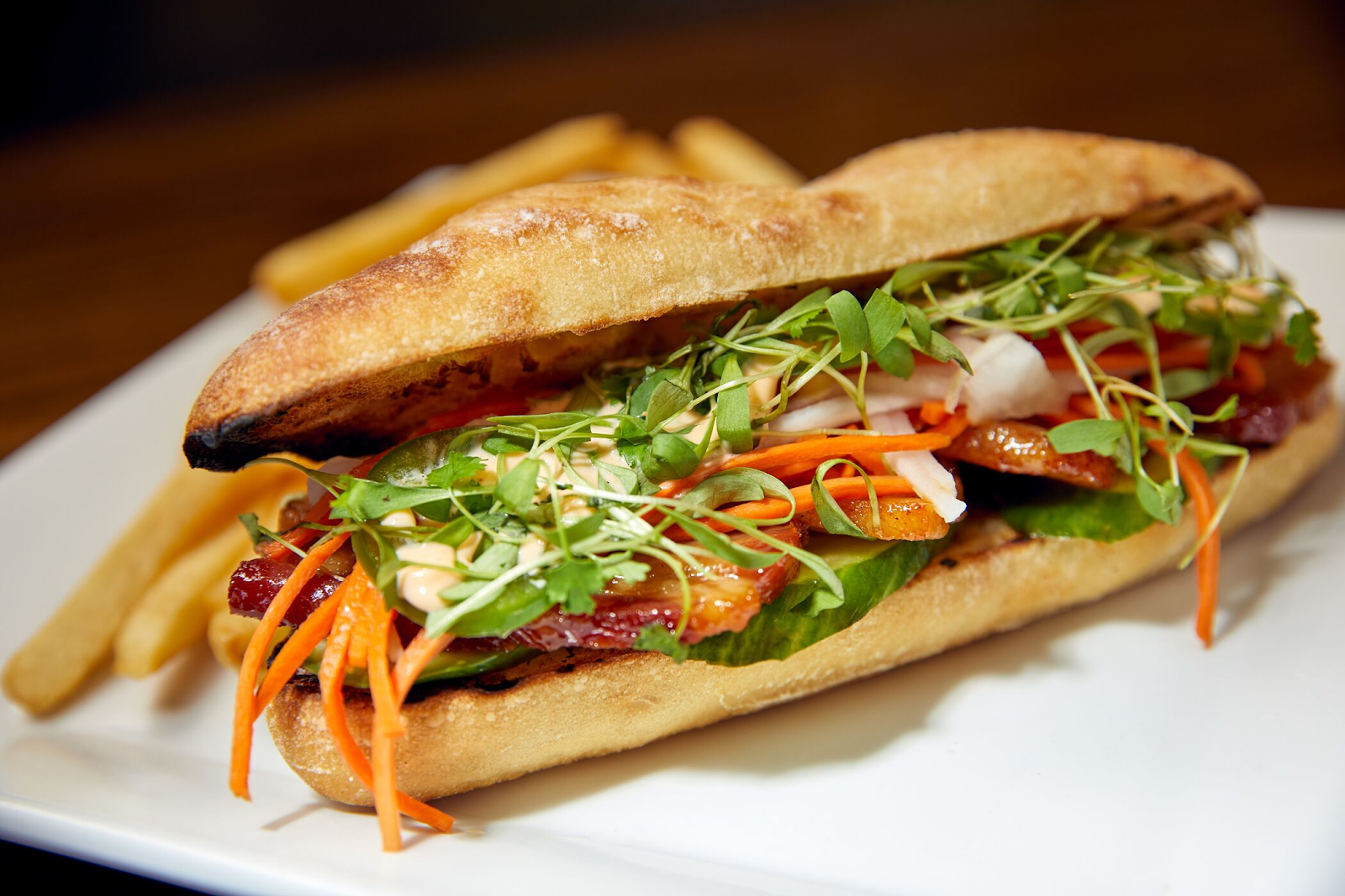 - Pork Belly Banh-Mi Sandwich: Roasted pork belly, pickled carrots, daikon radish and cucumber topped with a chile aioli on a French baguette