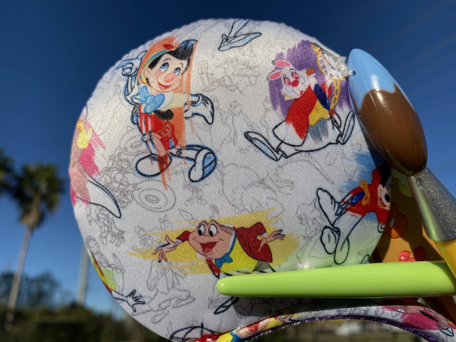 The pattern on each ear features classic Walt-era characters with a mix of pencil and paint to showcase the animation process. Characters include Sorcerer Mickey, Pinocchio, Dumbo, Mr. Toad, and the White Rabbit in full color. Behind them are pencil-only characters including the Three Caballeros, Johnny Fedora and Alice Bluebonnet, Alice, penguins from Mary Poppins, Hyacinth Hippo and Ben Ali Gator, Pedro the airplane, and more.