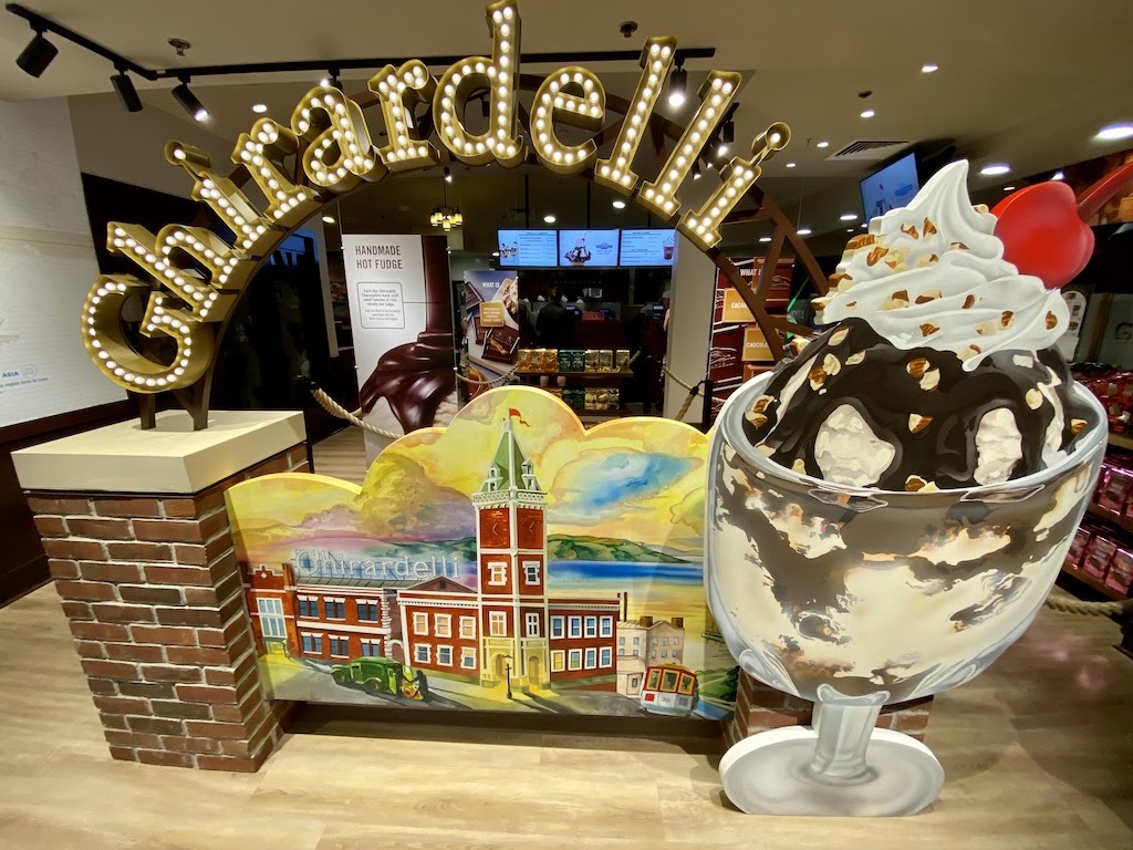 When entering the Soda Fountain, guests will be greeted by this facade featuring the signature lighted Ghirardelli sign, a painting of one of their flagship locations, and of course, a giant ice cream sundae—with a cherry on top!