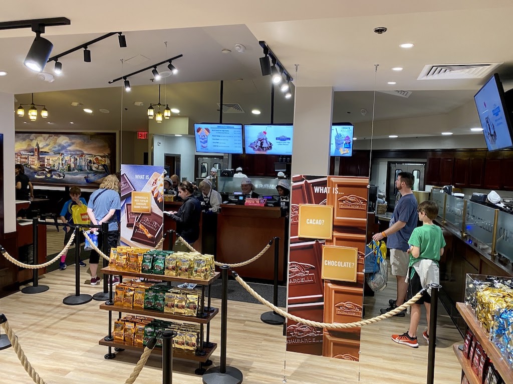 This new setup features grab and go displays with bags of Ghirardell’s famous chocolate squares that guests can purchase when ordering their speciality desserts. Additionally, new track lighting has been installed providing cool tones without being overly bright; and new wood panel flooring adds to the clean polished feel replacing the former soda fountain tiles.