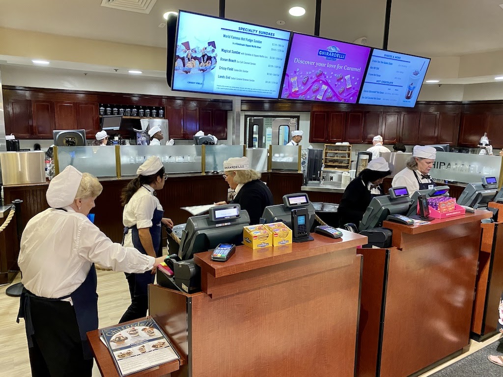 The Soda Fountain still has two registers as well as three digital menu boards highlighting signature sundaes, and seasonal specials.