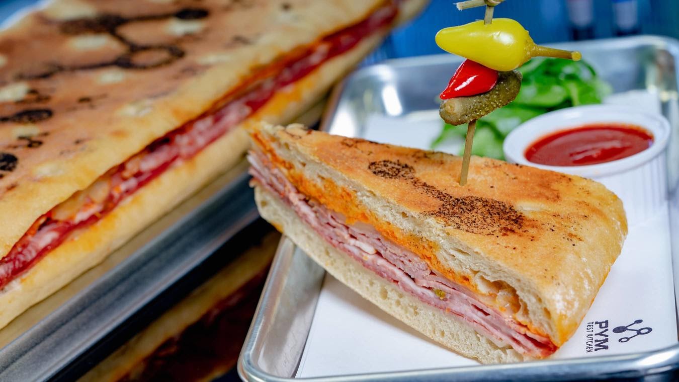 - Experiment No. EE10: PYM-ini - The full sandwich is two feet long, and 9 inches wide after it comes out of the Quantum tunnel — and while it can be ordered family style, it can also be done in individual slices, too.The PYM-ini features toasted focaccia with salami, rosemary ham, provolone, sun-dried tomato mayonnaise and arugula with marinara dipping sauce. There’s also a version for little Avengers, the Teeny Pym-ini, which is ham, provolone cheese, a touch of mayonnaise, and focaccia.