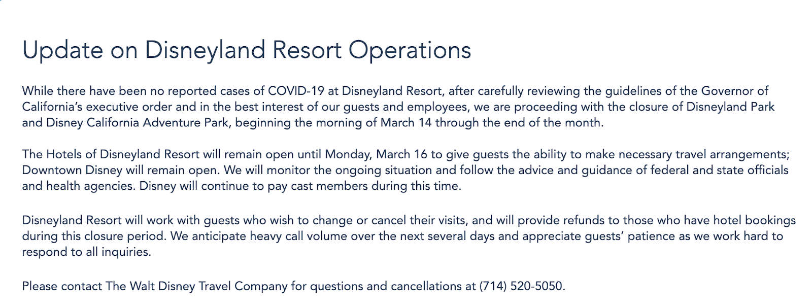 - Statement posted to Disneyland.com “While there have been no reported cases of COVID-19 at Disneyland Resort, after carefully reviewing the guidelines of the Governor of California’s executive order and in the best interest of our guests and employees, we are proceeding with the closure of Disneyland Park and Disney California Adventure, beginning the morning of March 14th though the end of the month. The Hotels of Disneyland Resort will remain open until Monday, March 16th to give guests the ability to make necessary travel arrangements; Downtown Disney will remain open.”