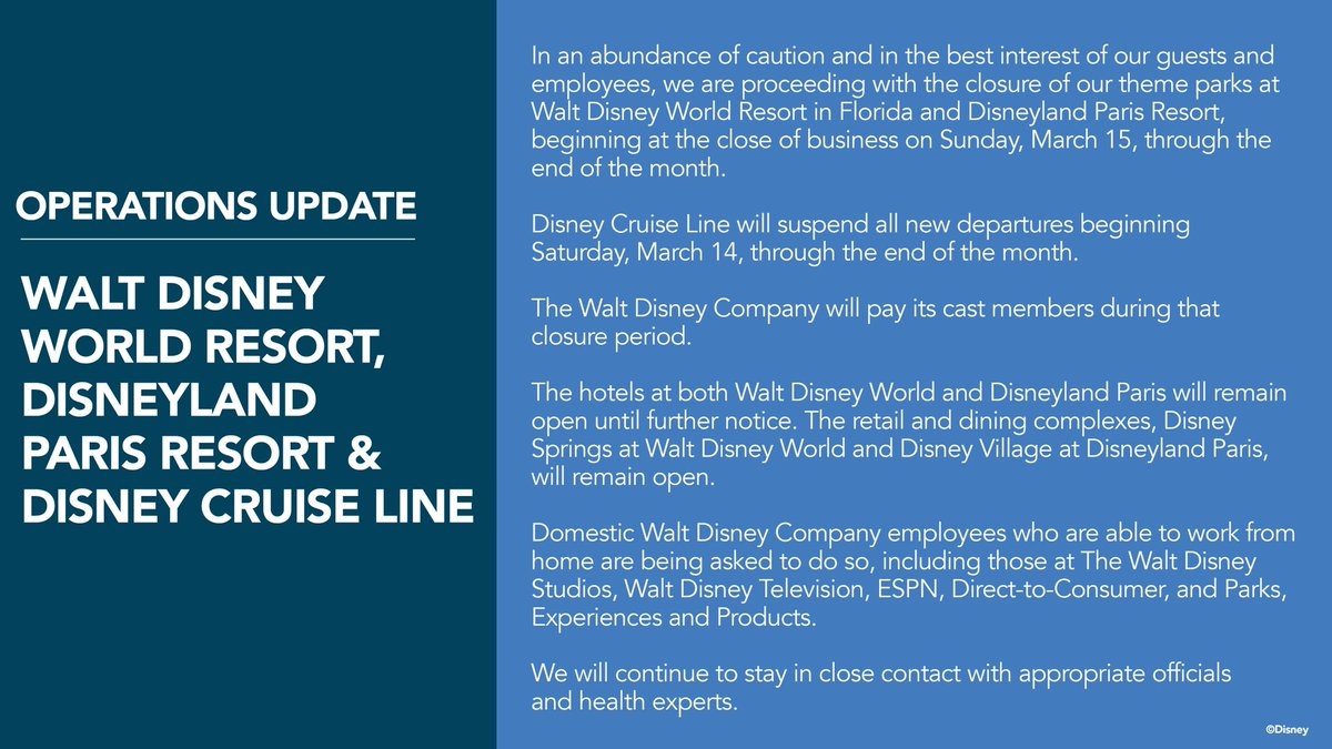 - Disney statement: “In an abundance of caution and in the best interest of our guests and employees, we are proceeding with the closure of our theme parks.”