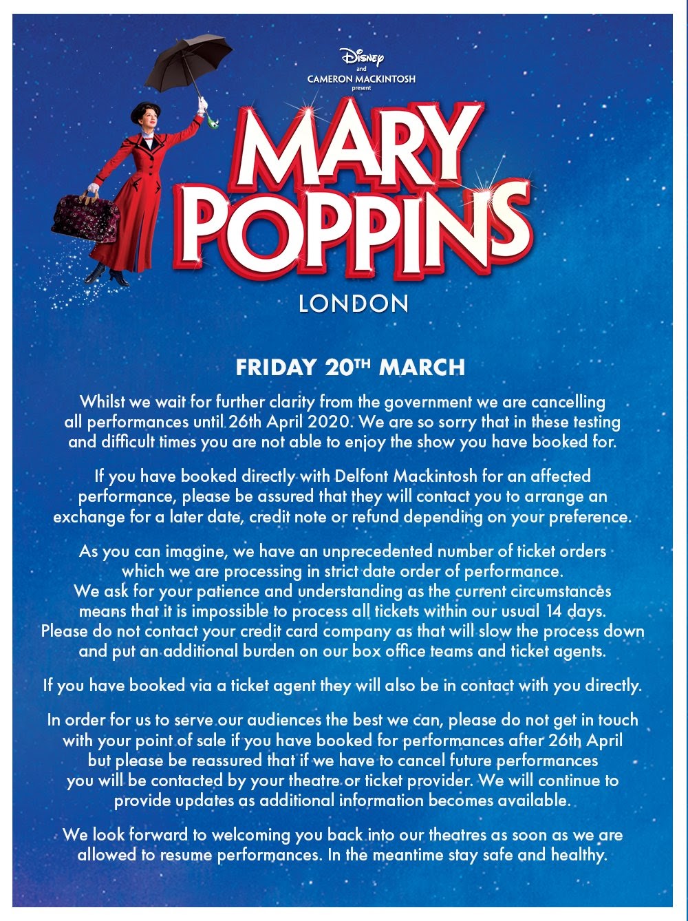 - This morning, Disney Theatrical announced the temporary cancellation of Mary Poppins, playing at the Prince Edward Theater in London since October 23rd, 2019, with a run that is scheduled to go until September 20th, 2020.