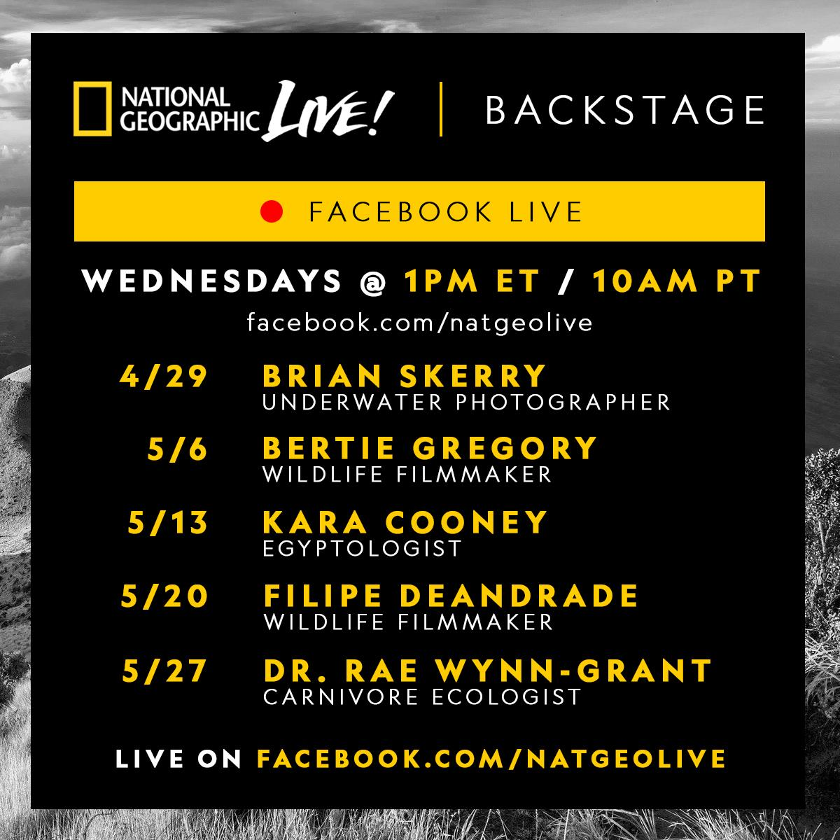 - National Geographic invites us to join them every Wednesday at 1pm ET / 10am PT for a special #stayathome experience as they go backstage with some of our favorite National Geographic explorers.