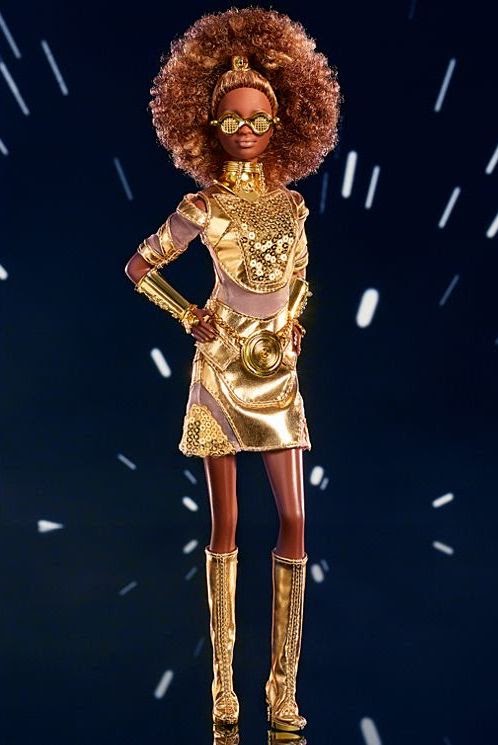 Description from Barbie.com: “Star Wars C-3PO x Barbie® doll shines in a head-to-toe liquid gold look with accents of sheer organza and golden sequins. Polished details include a golden collar, bangles, C-3PO-inspired glasses and a brilliant cincture echoing the droid’s primary power coupler outlet.”