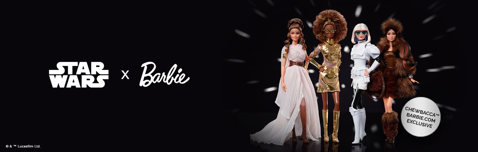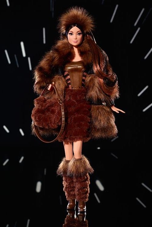Description from Barbie.com: “Star Wars Chewbacca x Barbie® doll wears a lavish faux fur coat over a strapless dress with a fur skirt and bodice of vinyl and sheer organza. Chic details include a furry headband and knee-high boots, as well as cuff bracelets and a handbag inspired by Chewbacca’s signature bandolier and satchel.”