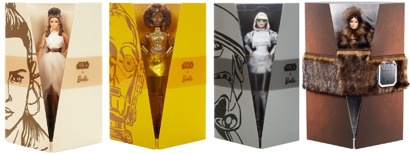 The second wave of the Star Wars x Barbie Collection includes three dolls available from all retailers and one Barbie.com exclusive. Rey, C-3PO, and Stormtrooper are part of the Barbie Signature Gold Label and will be sold at multiple retailers with a suggested retail value of $100. Barbie.com’s exclusive Chewbacca doll is part of the Barbie Signature Platinum Label, which has a higher price tag of $150. Mattel is offering bundles of the three general release dolls at a discount of $270, but the Chewbacca doll is only available separately.