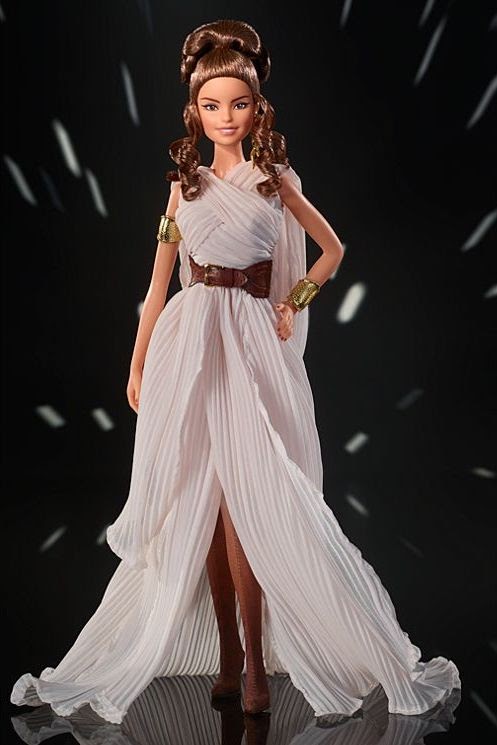 Description from Barbie.com: “Star Wars Rey x Barbie® doll wears a crystal pleated chiffon gown with a crossover neckline and draped hood, inspired by Rey’s gauzy crosspiece. A slit reveals ombre boot-leggings in gold and copper hues, and accessories with a hammered gold look complete her heroic ensemble.”