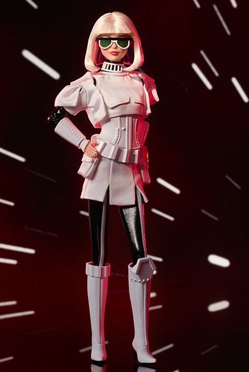 Description from Barbie.com: “Star Wars Stormtrooper x Barbie® doll is striking in head-to-toe white over a black bodysuit with a shiny patent-leather look. A platinum bob, dark glasses, cuffs, a utility belt and boots with a knee protector plate detail complete the battle armor-inspired look.”