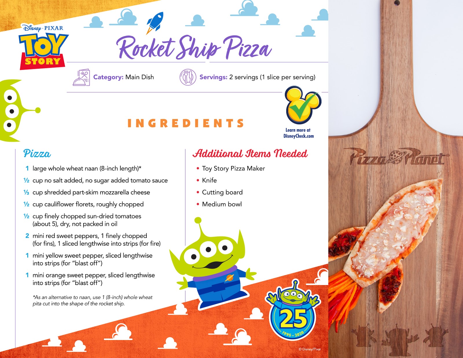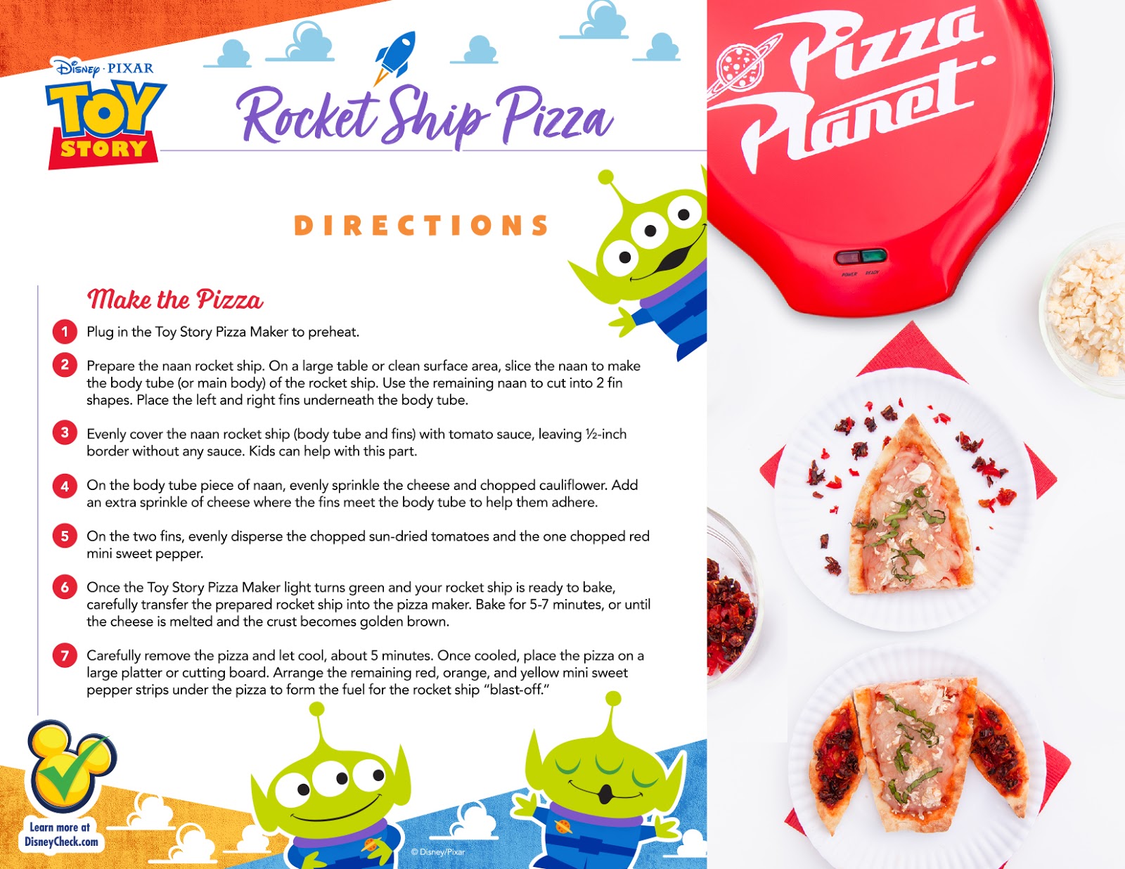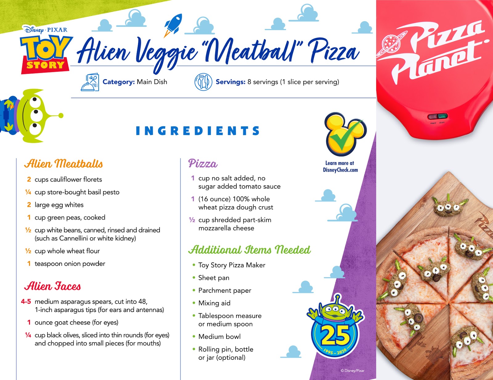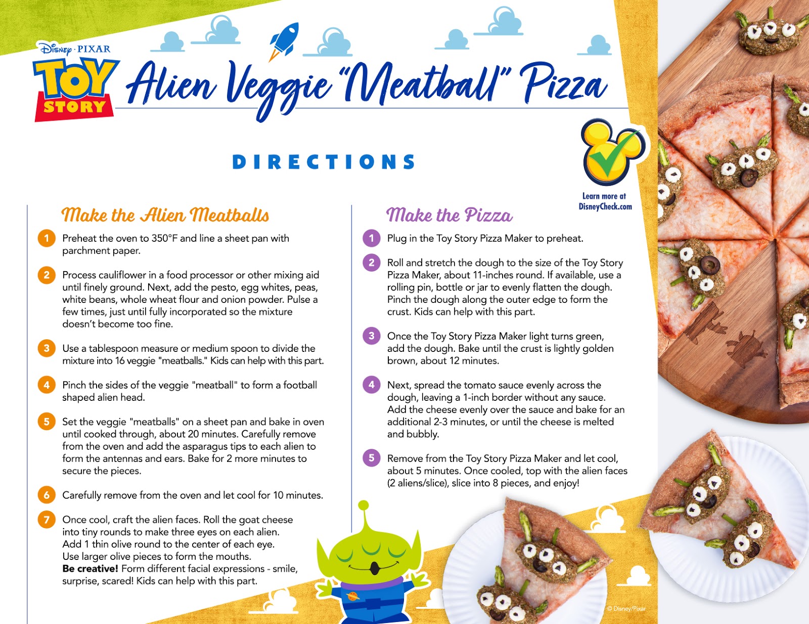 Happy National Pizza Party Day! Disney has shared two Toy Story themed recipes from Pizza Planet that families can make together. First up is the Alien Veggie Meatball Pizza, which uses baked pureed cauliflower “Meatballs” that can be shaped to look like Little Green Men.