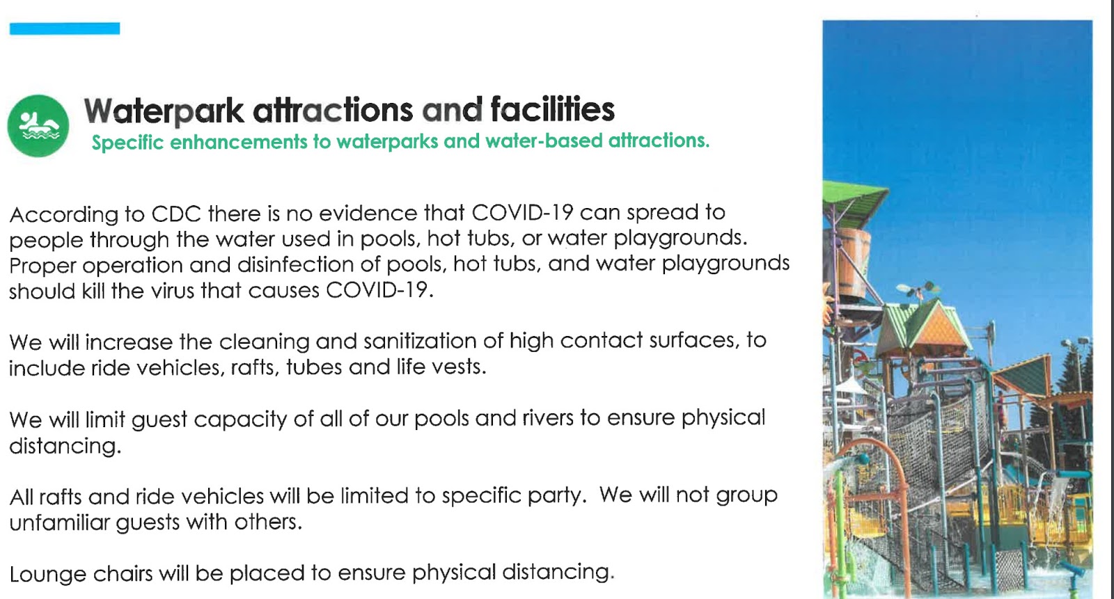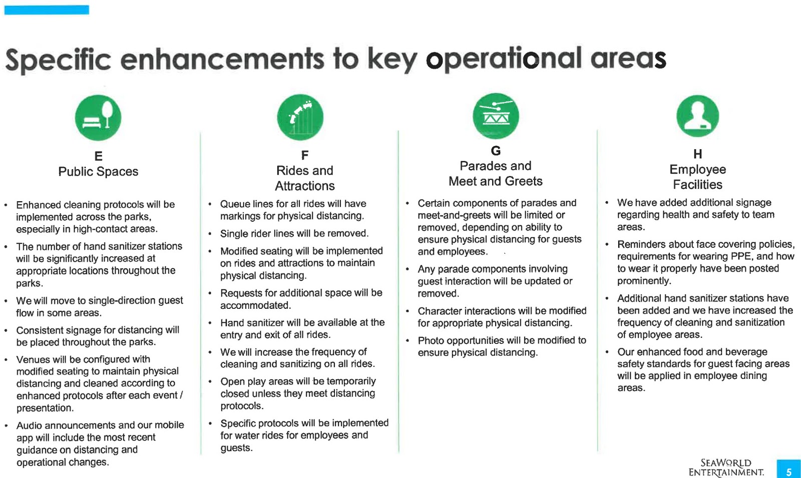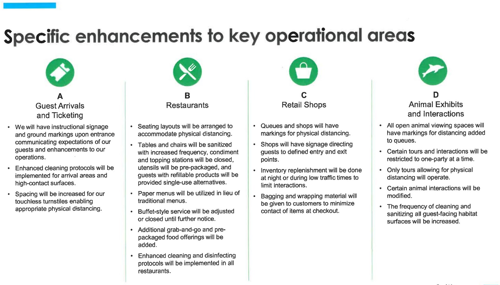 - Regarding Aquatica and Discovery Cove, the presentation included CDC advisements that COVID-19 does not travel in water environments with proper sanitation, and reinforced their cleaning policies as well as increased cleaning of high contact surfaces like Rafts and Life Vests.