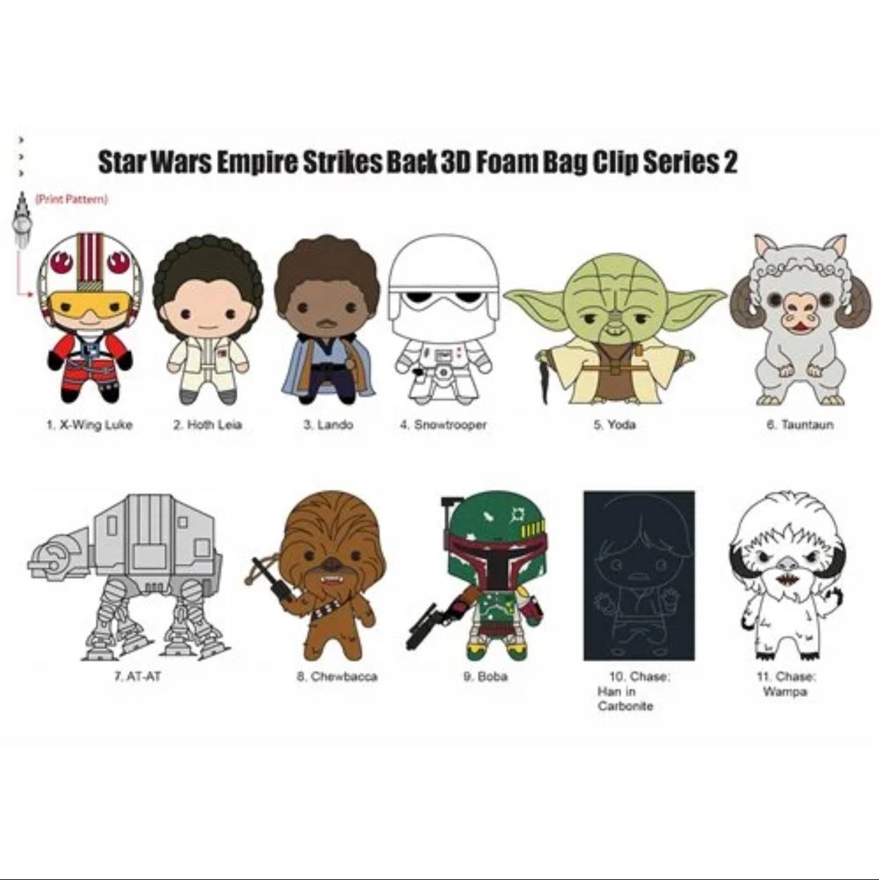 - Bag clips include the characters Luke Skywalker (in Snowspeeder pilot gear), Princess Leia Organa (in her Ice Planet Hoth outfit), Lando Calrissian, Yoda, Chewbacca, Boba Fett, and a Snowtrooper. Creatures and vehicles include a Tauntaun and an Imperial AT-AT Walker. The special rare chase clips are the Wampa and Han Solo in Carbonite.