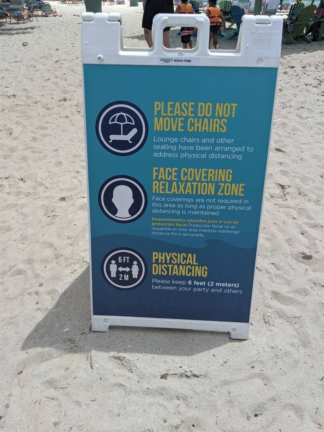 Signage throughout Aquatica reminds visitors to keep 6-feet distance from other parties, such as the sign above where chairs have been spaced out to keep the required amount of distance.