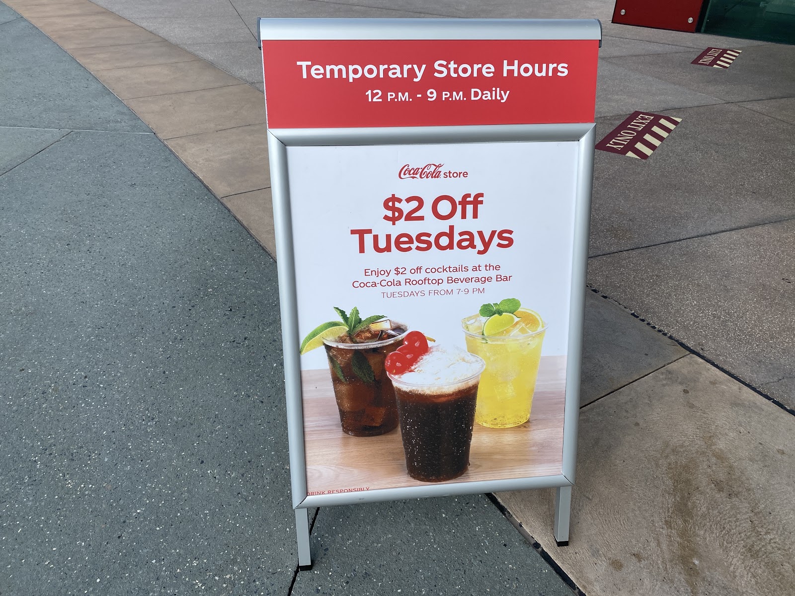 Outside the shop, an A-Frame was advertising the Tuesday special at the Coca-Cola Rooftop Beverage Bar, an open-air lounge with beautiful views of Disney Springs.