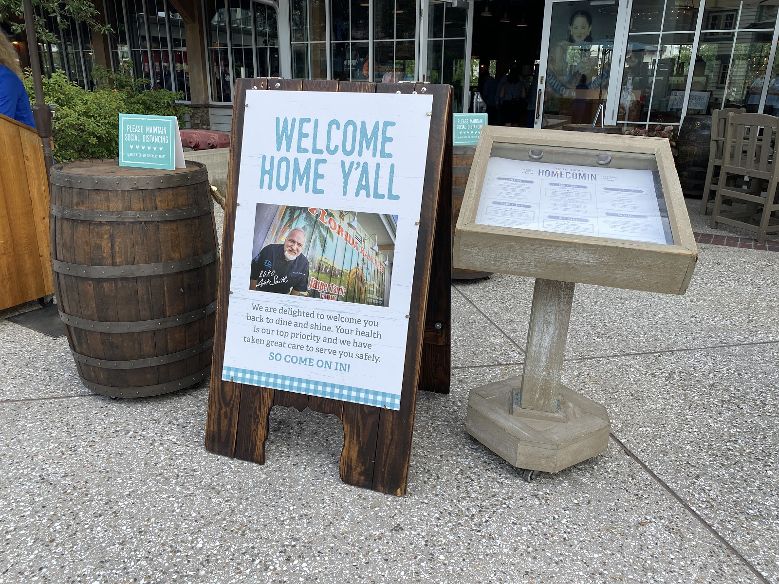 Moving on to Art Smith’s Homecomin’, the chef himself is welcoming Guests back… via an A-frame outside the restaurant.