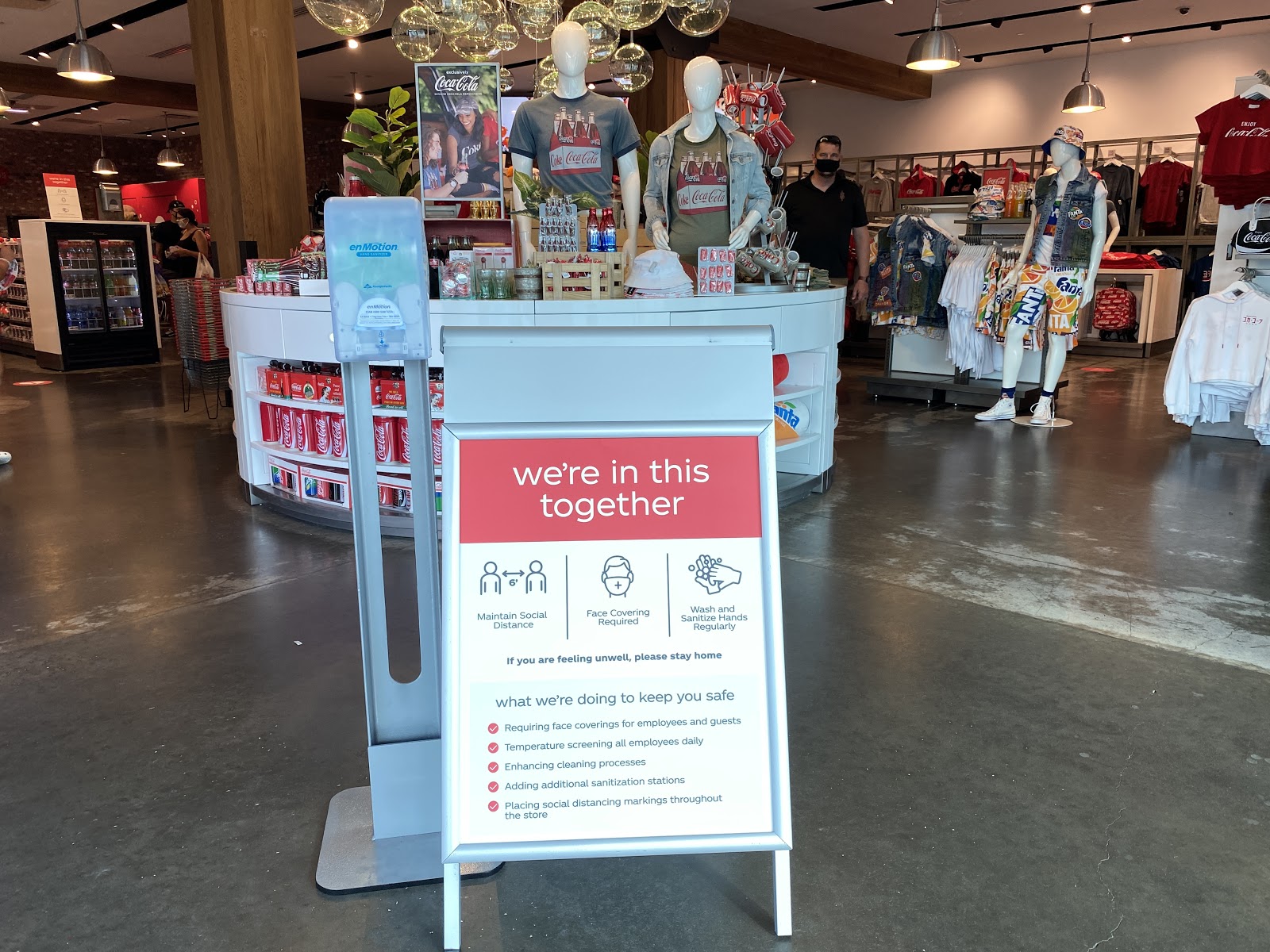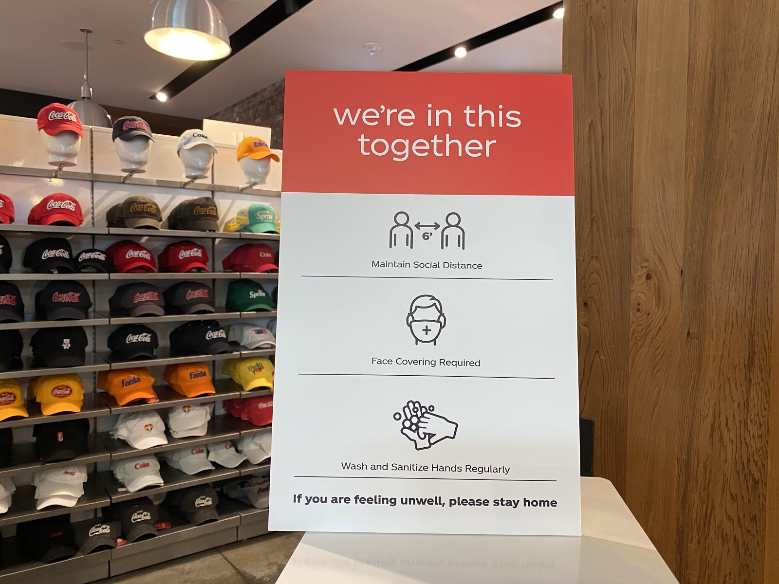 Reminders have been added throughout the store about their policies, which include wearing a face covering, maintaining social distance, and washing hands regularly. Hand sanitizer is available throughout the multi-level shopping experience.