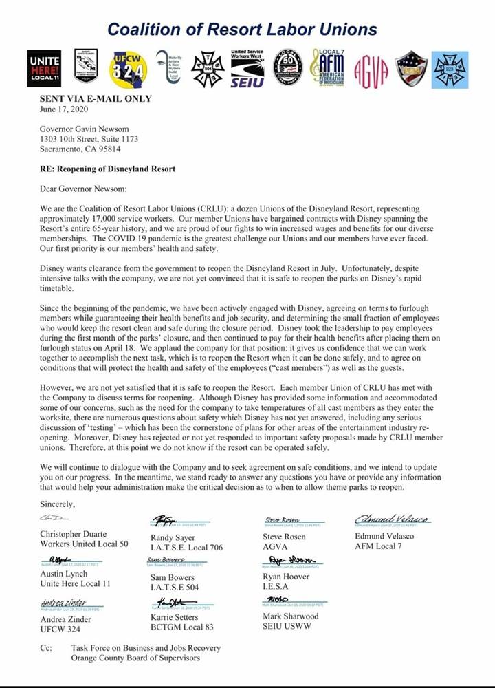 - Eleven unions representing Cast Members at the Disneyland Resort have shared the letter below that was sent to California Governor Gavin Newsom.