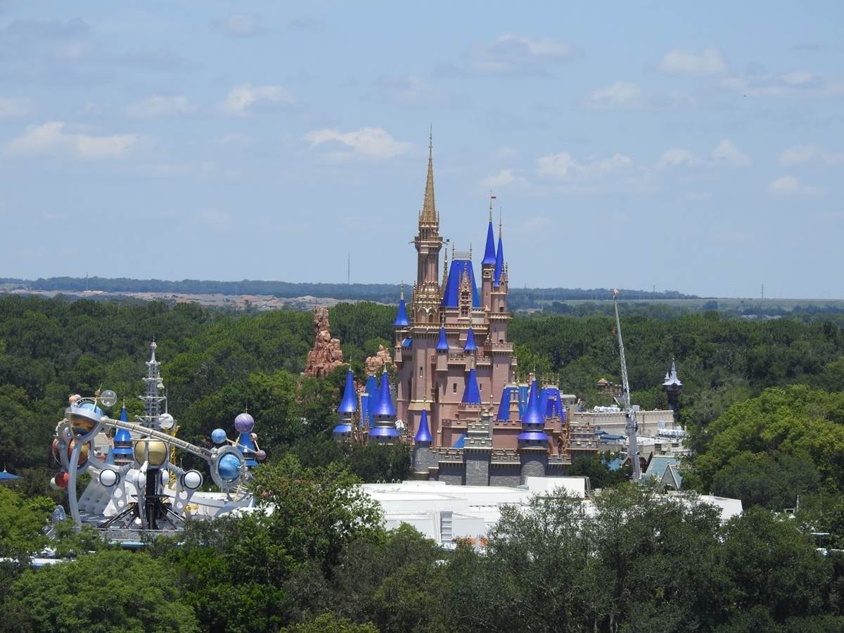Walt Disney World welcomed Guests back to select Disney Resorts today and one of our Florida correspondents, Jeremiah Good, is enjoying a night at Bay Lake Tower, a Disney Vacation Club resort at Disney’s Contemporary. He was able to see some incredible sights from his balcony, including our first close-up look at the work being done on Cinderella Castle at Magic Kingdom Park.