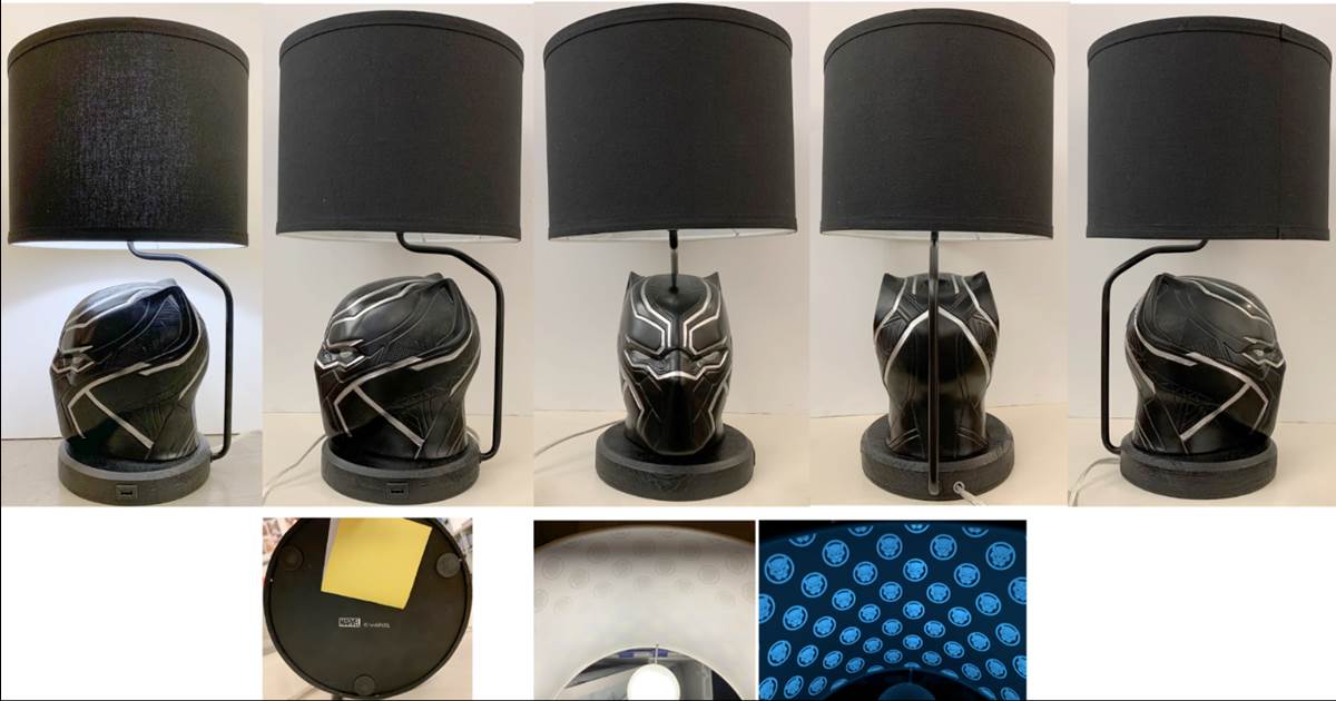 - Black Panther Helmet Table lamp – glow-in-the dark features detailing inside the lampshade, making the lamp glow long after it is turned off.