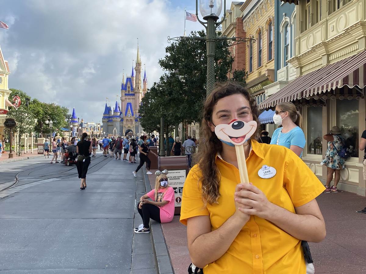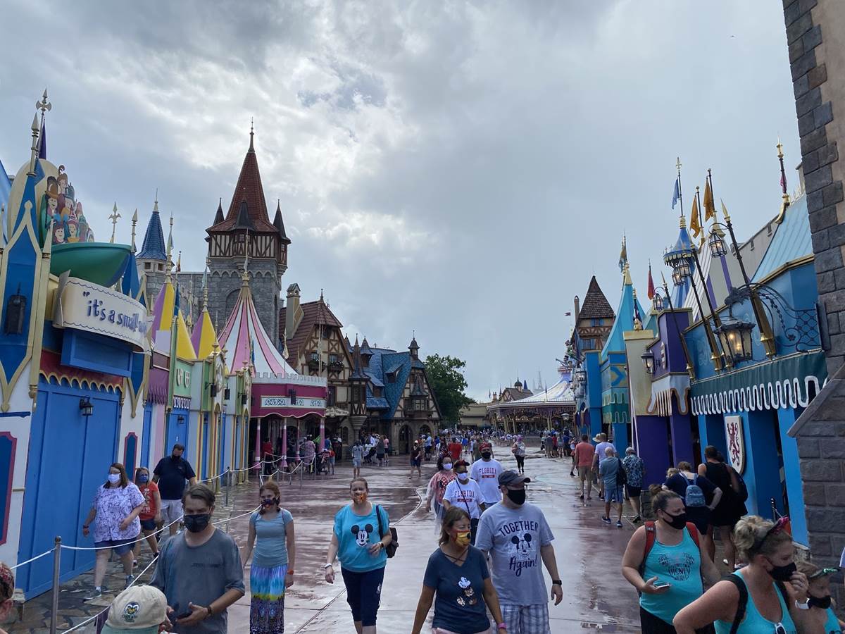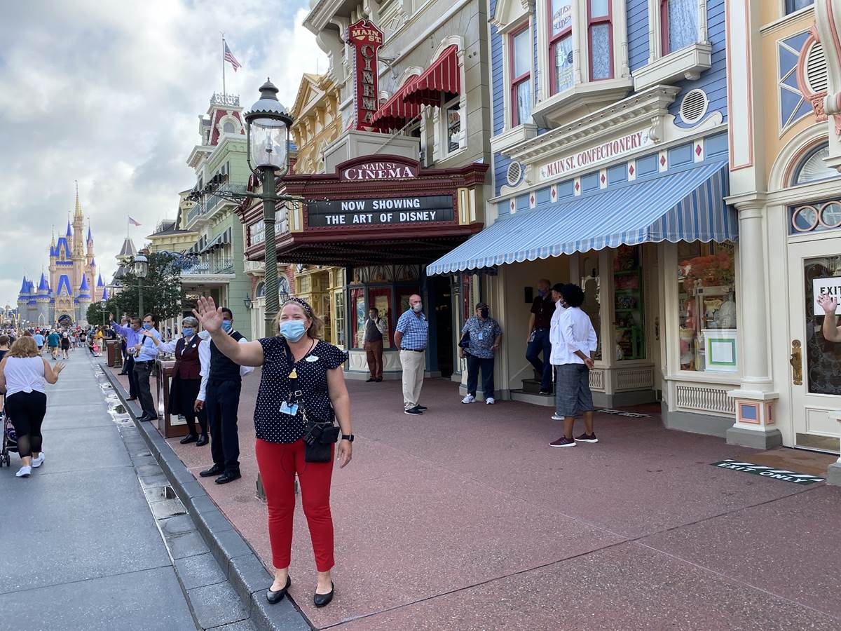 Cast Members line Main Street USA to welcome Guests back, with Cast Members in yellow shirts with smiling character fans helping to enforce mask policies. If a Guest has a mask that doesn’t cover their nose and mouth, they will intervene to enforce the policy.