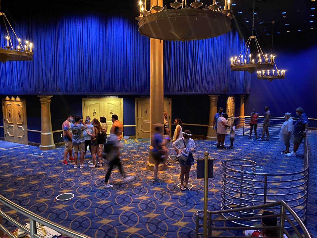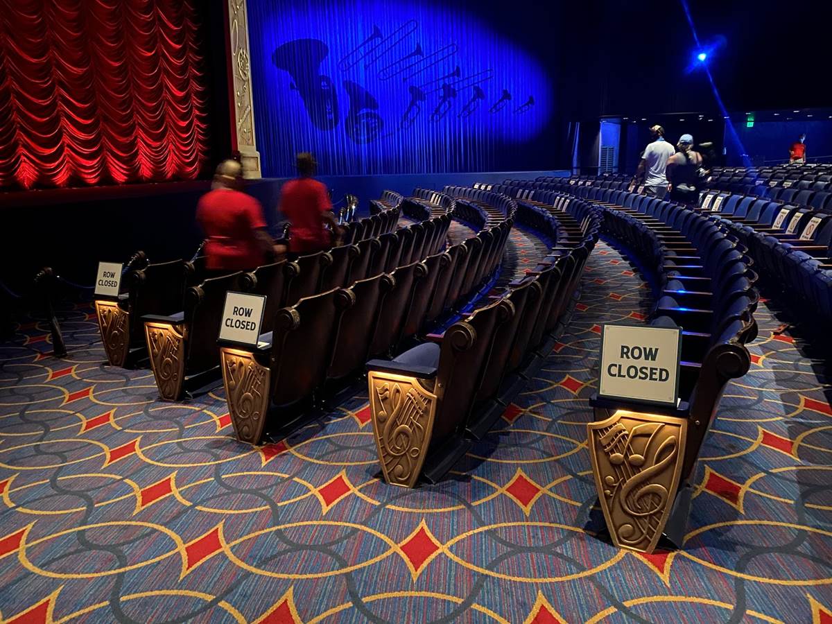 Movie theaters are still closed in Florida, but Mickey’s Philharmagic offers a 4D cinematic experience. The pre-show area features group markers for parties to stand on and the theater blocks off every-other-row and groups of seats to keep parties separated.